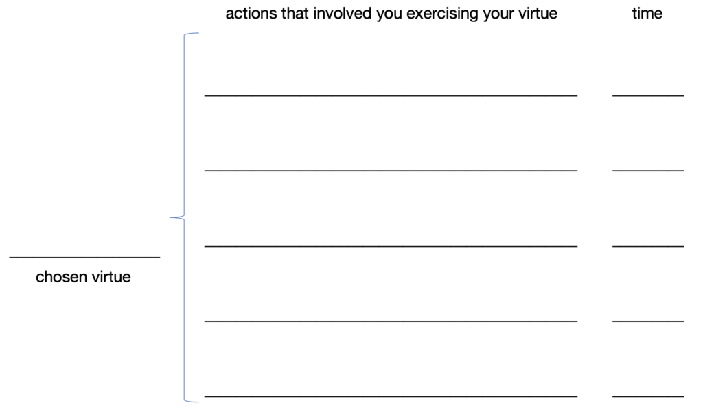 It will be a good idea at this point to devise some activities for yourself today that will allow you to exercise your chosen virtue. Throughout your day, keep a running list of the actions you complete—you should do at least three. Log the time of day on a list resembling the one below and explain what you’ve done to turn your chosen virtue into a habit. In the same way that anyone who develops skill in a craft engages in active practice to perfect their abilities, Aristotle thinks it’s by these means that you’ll end up developing a virtuous character.